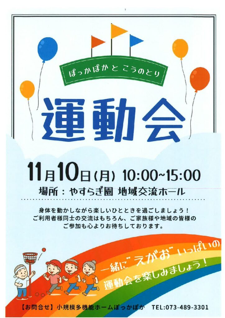 いつもぽっかぽかをご利用、ご支援いただき誠にありがとうございます。 来たる11月10日(月)に、紀美野町総合福祉センター隣にある『特別養護老人ホームやすらぎ園』の地域交流ホールをお借りして、利用者さま、ご家族、地域の皆さまとの交流の場として運動会を開催させていただきます。