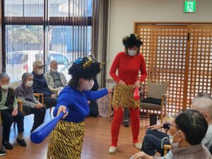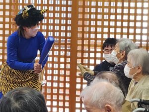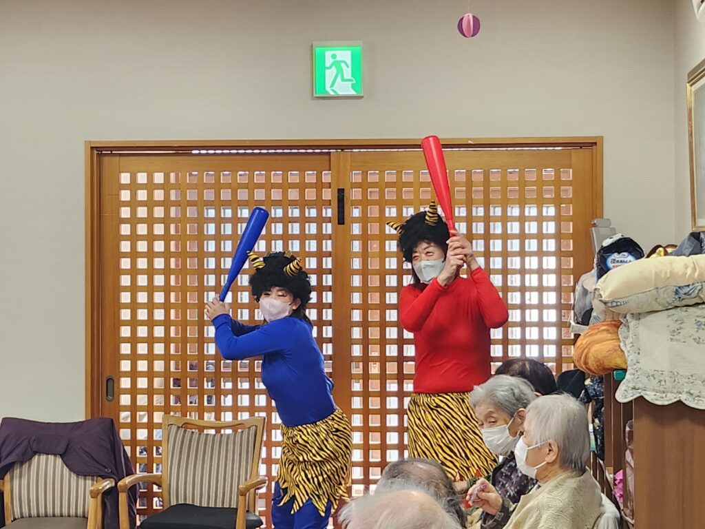 赤鬼・青鬼が元気よく登場すると、「来た来た!」と、利用者皆さんの表情が一気に困惑モードに。「鬼は外〜!福は内〜!」の掛け声とともに、手に持った豆を力一杯ブン投げては次々と鬼へ命中。最初は遠慮がちだった方も、気がつけば腕を大きく振ってフルスイング!今回の鬼役は社長、〇〇職員。笑い声がフロアいっぱいに広がりました。無事に鬼を追い払ったあとは、「これで今年も元気に過ごせるね」「楽しかったね」と、ほっと一安心。ぽっかぽかならではの“笑顔いっぱい節分”となりました。