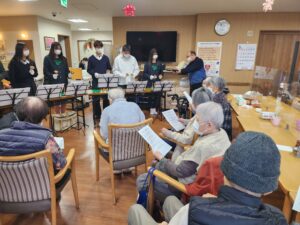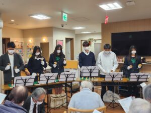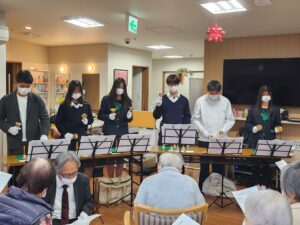 演奏が始まると、澄んだ音色がフロアいっぱいに広がりました。まずは♪「見上げてごらん夜の星を」優しいベルの音色に包まれ、会場はしっとりとした雰囲気に。皆さんの表情もやわらぎ、どこか懐かしさを感じておられる様子でした。続いて♪「上を向いて歩こう」イントロが鳴った瞬間、「あっ、知ってる!」と笑顔がぱっと広がります。自然と口ずさむ方、リズムに合わせて手拍子をされる方も。そして最後は…♪笑点のオープニング曲!これには会場が一気にヒートアップ。若さあふれる一生懸命な演奏と、利用者様のあたたかい笑い声。音楽の力で世代を超えて心がつながる、そんな素敵な時間となりました。慶風高等学校の皆さん、本当にありがとうございました。また皆さんの素敵な音色が響く日を、ぽっかぽか一同、心より楽しみにしております。
