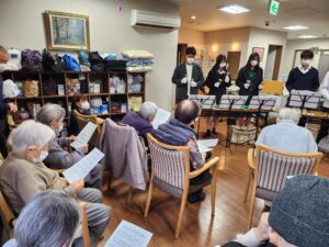 本日、小規模多機能ホームぽっかぽかに、慶風高等学校の皆さんが慰問に来てくださいました。「今日は何があんの?」「何処から来たんよ?」と、皆さんどこかワクワクしたご様子。ゴールドに輝くハンドベルを手に並ぶ生徒さんたち。
